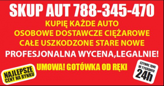 Kupie kazde auto osobowe dostawcze ciężarowe ,całe lub uszkodzone gotówka od reki motocykle,najlepsze ceny na rynku,legalnie,umowa, zadzwon lub wyslij sms-a a przyjedziemy i wycenimy twoje auto ,lub e-mile (skorzystaj z formularza) 788 345 470 czynne 24 godziny siedem dni w tygodniu.